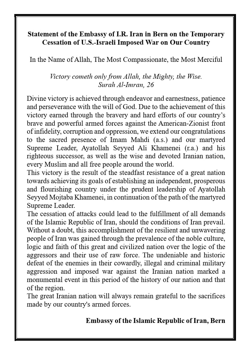 Statement of Embassy of I.R. Iran in Bern on the Temporary Cessation of U.S.-Israeli Imposed War on Our Country